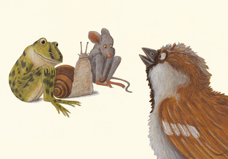 Die Maus, die Schnecke, der Frosch und der Spatz veranstalten einen Wettkampf. Wer ist am mutigsten? Maus, Frosch und Schnecke trauen sich Dinge, die sie sonst nie tun würden! Mutig, mutig! Sie ernten großen Applaus. Und jetzt schauen alle zum Spatzen, was er wohl wagen wird?