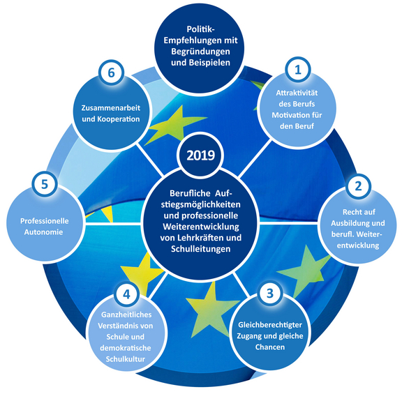 - für eine qualitativ hochwertige und inklusive Ausbildung, Berufseingangsphase und fortwährende berufliche Weiterentwicklung von Lehrkräften und schulischen Führungskräften als Recht einzutreten
