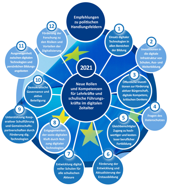 Der Schwerpunkt des zweiten Projektjahres LAG auf der Unterstützung von Schulleitung und Unterricht im digitalen Zeitalter, wobei die Auswirkungen der COVID-19-Pandemie auf die Bildung berücksichtigt wurden. Das EEPN Netzwerk hat zwölf Empfehlungen zu politischen Handlungsfeldern 2021 in Bezug auf neue Rollen und Kompetenzen für Lehrkräfte und schulische Führungskräfte im digitalen Zeitalter entwickelt.