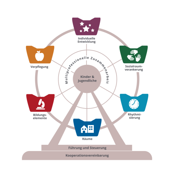 Die Rahmenbereiche bilden das Gerüst des Ganztagsriesenrades. Sie ermöglichen die Umsetzung der Kernbereiche und schaffen die Voraussetzungen der Qualitätsentwicklung. Ohne eine Arbeit an den Rahmenbereichen kann die ganztägige Bildung und Betreuung nicht funktionieren und die Kernbereiche nicht einheitlich gestaltet werden. Legen Sie in der Qualitätsentwicklungsarbeit also besonderen Fokus auf das Umsetzen der Rahmenbereiche als Grundlage von ganztägiger Bildung und Betreuung. Die Formulierung der Rahmenbereichen beruht auf den folgenden KMK Empfehlunge: