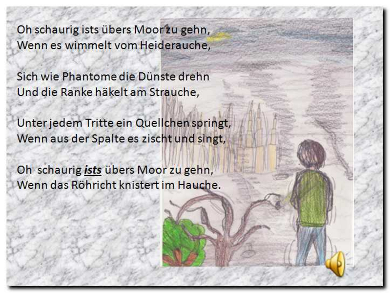 Im Anschluss wird mit dem Programm „Powerpoint“ oder einer anderen Präsentationssoftware gearbeitet. Jede Strophe bekommt eine eigene Folie mit der Illustration, dem Strophentext und der dazugehörigen Audiodatei.