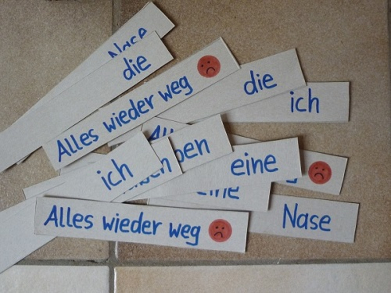 Beschriften Sie jede Karte mit einem Übungswort. Die Wörter können auch doppelt auftauchen. Schreiben Sie auf 2 oder 3 Karten: Alles wieder weg!