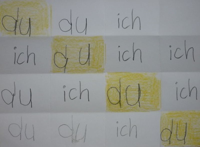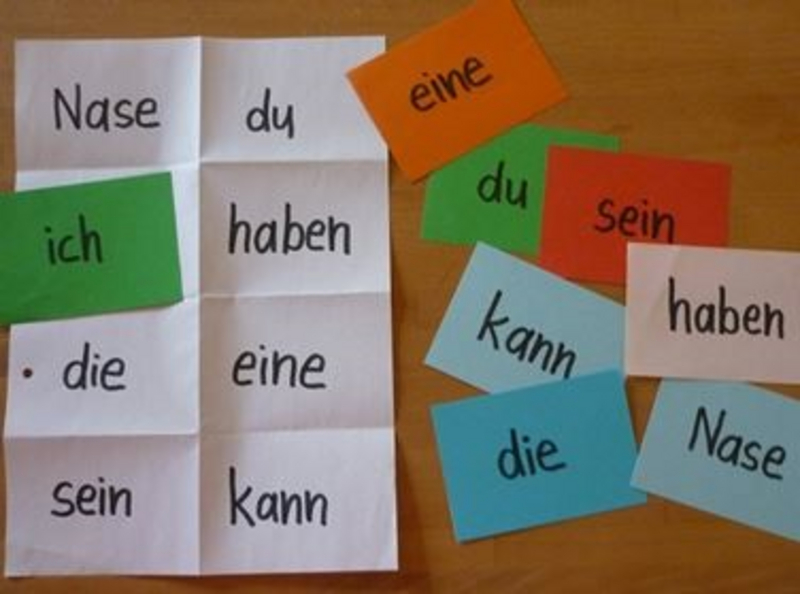 Falten Sie beide Blätter einmal der Länge nach und dreimal in der Breite. So erhalten Sie 8 Felder wie auf dem Foto. Schreiben Sie in jedes Feld ein Übungswort - es müssen auf beiden Blättern dieselben Wörter sein. Zerschneiden Sie ein Blatt zu 8 Kärtchen. Nun nimmt Ihr Kind ein Kärtchen, liest das Wort vor und legt es auf das richtige Feld des Wörter-Blattes.