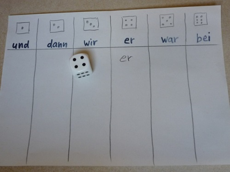 Zeichnen Sie auf ein Blatt eine Tabelle mit sechs Spalten. In jede Spalte kommt oben ein Würfelbild und darunter ein Häufigkeitswort. Nun wird abwechselnd gewürfelt. Würfelt Ihr Kind zum Beispiel eine 4, so schreibt es lesbar das zur 4 passende Wort in die Spalte. Es wird solange gewürfelt und geschrieben, bis die Tabelle ausgefüllt ist. Am Schluss werden die geschriebenen Wörter gemeinsam betrachtet. Auf besonders gelungene Wörter des Kindes und der Eltern wird ein Krönchen oder Herzchen gezeichnet.