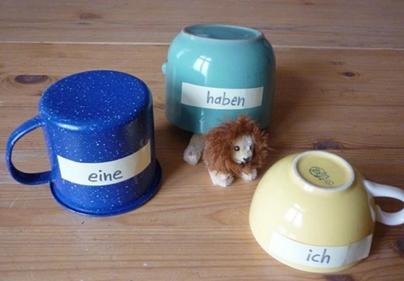 Befestigen Sie mit Klebefilm auf jeder Tasse ein Übungswort. Verstecken Sie die Figur unter einer Tasse. Ihr Kind rät nun, wo die Figur versteckt ist und liest das Wort auf dieser Tasse vor. Dann hebt ihr Kind die Tasse hoch. Es wird so lange gespielt, bis die Figur gefunden wurde.