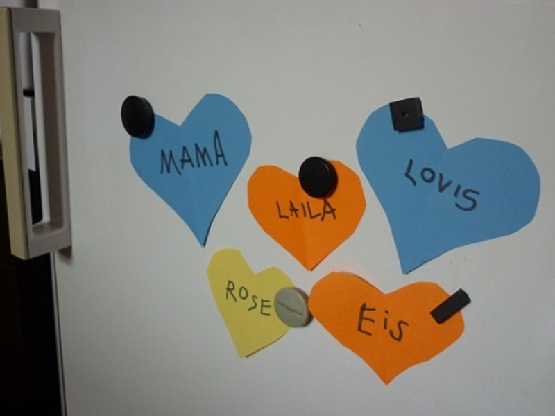 Sammeln Sie die Lieblingswörter Ihres Kindes auf einer speziell dafür vorgesehenen Wand oder Tür. Ihr Kind kann diese Wörter auf herzförmiges Papier schreiben. Sie können auch Ihre eigenen Lieblingswörter aufschreiben und dazu hängen.