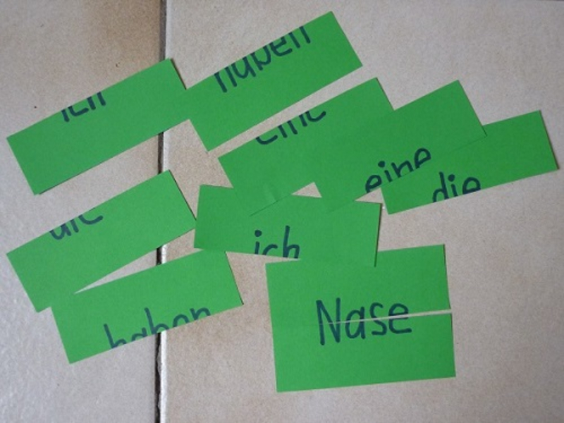 Falten Sie jedes Kärtchen einmal längs in der Mitte, damit Sie eine Orientierung haben. Schreiben Sie auf jedes Kärtchen ein Übungswort – genau mittig auf die Faltlinie. Schneiden Sie dann die Kärtchen an der Faltlinie durch. Nun kann Ihr Kind puzzlen und die Wörter wieder zusammensetzen.