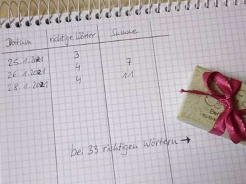 Diese Übung dauert mehrere Wochen. Dabei diktieren Sie mehrmals wöchentlich die Wochenwörter. In einer Liste wird notiert, wie viele Wörter schon ganz korrekt geschrieben wurden. Bei einer vereinbarten Anzahl richtig geschriebener Wörter, zum Beispiel 33 (66, 99), kann eine passende kleine Aufmerksamkeit vereinbart werden. (zum Beispiel ein neuer Schreibstift, ein cooler kleiner Schreibblock, ein bunter Haftnotizblock)
