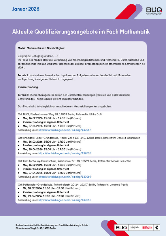 Die aktuellen Qualififizierungsangebote der Mathematikwerkstatt finden Sie hier zum Download.
