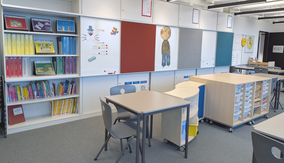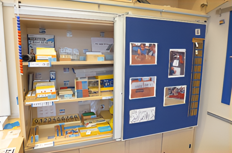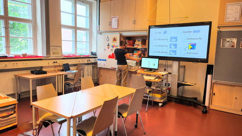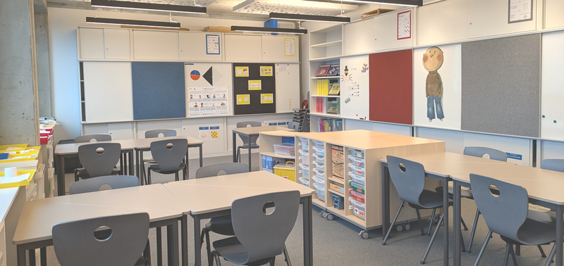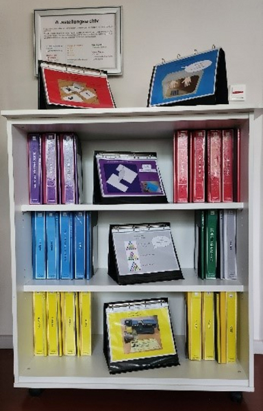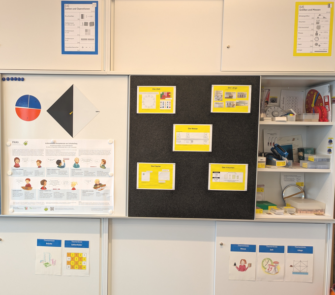 In dem Werkstattraum stehen farblich gekennzeichnete Schränke passend zu den fünf Leitideen des Rahmenlehrplans Mathematik. In den Schränken befindet sich eine breite, nach Themenbereichen sortierte Auswahl von Materialien, die sich für einen handlungsbasierten Fachunterricht eignen.