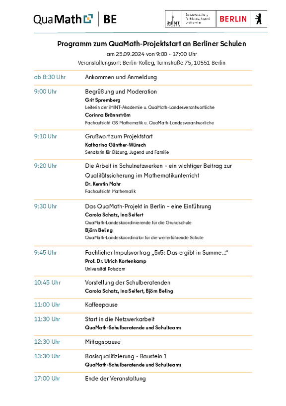 Am 25.09.2024 eröffnete Christina Henke, Staatssekretärin für Bildung zusammen mit den Landesverantwortlichen Grit Spremberg, Corinna Brännström und den Landeskoordinatoren Björn Beling, Carola Schatz und Ina Seifert das Programm QuaMath in Berlin. Im Schuljahr 2024/25 nehmen 219 Lehrkräfte aus 58 Schulen daran teil.