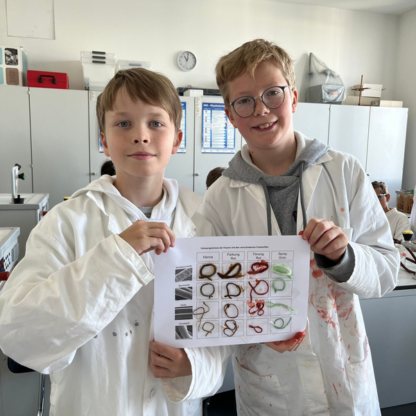 Senatorin Katharina Günther-Wünsch besucht am 2. August 2023 den Sommerkurs für Schülerinnen und Schüler an der HU Berlin. An diesem Tag wird experimentiert mit Fasern und Farben zum Thema: „Haare färben – heute blond und morgen blau?“