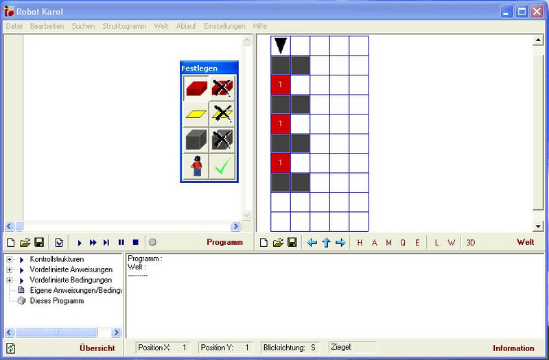 Die Oberfläche enthält ein Spielfeld und einen Programmeditor. Das Spielfeld kann mit Gegenständen (Ziegeln) und Hindernissen (Quadern) und Marken belegt werden. Es lässt sich im 2D- und im 3D-Modus darstellen.