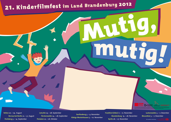 Kinderfilmfest 2012"Mutig, mutig!" – der Titel nimmt das inspirierende Potenzial des Films ernst und will Ermutigung sein: In allen Filmen stehen die Heldinnen und Helden vor Herausforderungen, müssen sie sich etwas zutrauen und in entscheidenden Momenten über sich hinauswachsen.