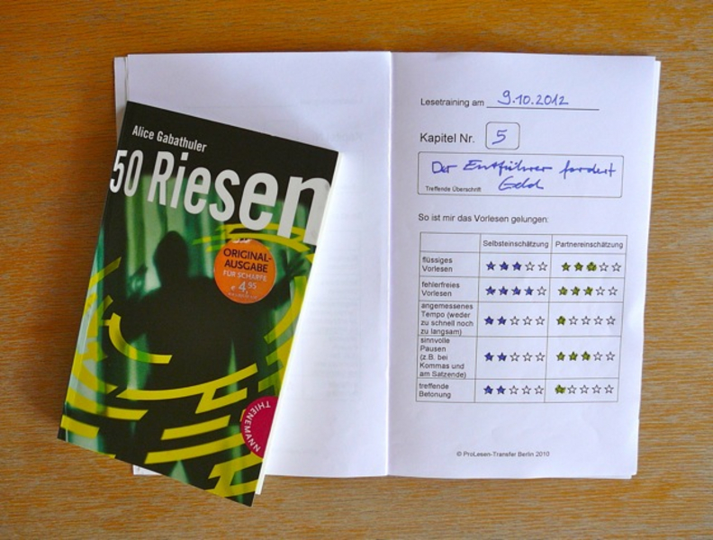 Dieses Lautlese-Training ist eine Variante des begleitenden Lautlesens. Ein Schüler-Tandem liest gemeinsam ein Kinder- oder ein Jugendbuch. Dabei ist eine Schülerin/ein Schüler das Lesemodell für eine weniger gut lesende Schülerin bzw. einen weniger gut lesenden Schüler. Anders als beim Training mit dem Buch "Kuckuck, Krake, Kakerlake" wird der Text nicht wiederholt gelesen. Das Lesemodell und die Trainingspartnerin/der Trainingspartner wechseln sich beim Vorlesen ab. Das Lesemodell demonstriert "allgemein", welches Tempo, welche Betonung usw. angemessen ist, und macht auf Lesefehler aufmerksam. Am Ende jeder Trainingseinheit bewerten die Schülerinnen und Schüler ihren Lesevortrag.