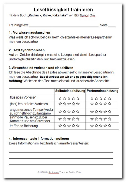 Die gut lesende Schülerin/der gut lesende Schüler fungiert dabei als Lesemodell und demonstriert, in welchem Tempo, mit welcher Betonung usw. der Text angemessen vorgelesen wird. Nach jeder Trainingseinheit werden der eigene und der Lesevortrag der Partnerin/des Partners auf einem Trainingsplan bewertet. Diese Bewertungen werden mit der Zeit immer realistischer, weil die Schülerinnen und Schüler ihre Leistungen zunehmend kompetent einschätzen können.