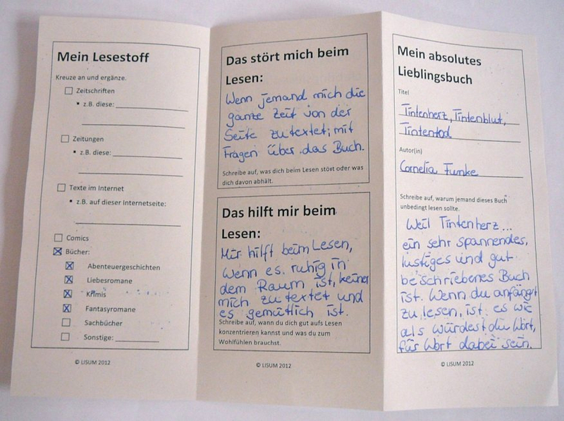- Mein Lesestoff (Auswahlantworten zum Ankreuzen: Zeitschriften, Zeitungen, Comics, Internetseiten, Bücher – Abenteuergeschichten, Liebesromane, Krimis, Fantasyromane, Sachbücher)