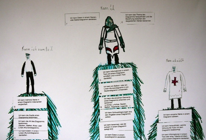 Lernlandkarten werden zur Selbsteinschätzung und zur Selbststeuerung von Lernprozessen in allen Fächern und in allen Jahrgangsstufen eingesetzt. Sie verschaffen den Schülerinnen und Schülern einen Überblick über den Lerngegenstand – in diesem Fall über die Kompetenzen, die für den Umgang mit Diagrammen benötigt werden – und unterstützen den Lernprozess. Die Schülerinnen und Schüler erhalten Kärtchen, auf denen die benötigten Teilkompetenzen als „Ich-kann-Aussagen“ formuliert sind. Sie ordnen die Kompetenz-Items den folgenden vier Aussagen zu: