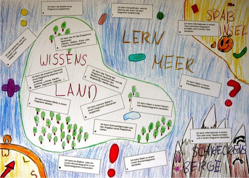 Auf einem DIN-A3-Blatt gestalten sie eine Landkarte mit Inseln, Kontinenten, Meeren, Flüssen, Städten, Dörfern usw. Den Gebieten geben die Schülerinnen und Schüler Namen, z.B. „Wissensreich“, „Stadt des Grauens“, „Lern-Insel“ usw. Auf den passenden Flächen werden die Kärtchen mit den Kompetenz-Items aufgeklebt.