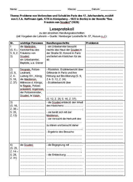 Kopiervorlage für ein Leseprotokoll zu "Das Fräulein von Scuderi"