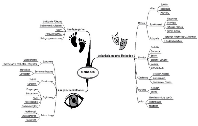 Eine Anregung für verschiedene Methodenvarianten soll diese Übersicht in Mindmap-Form geben: Rundgänge zu zweit (Partnerlerngänge) erfordern von den Schülerinnen und Schülern großes Engagement, da die Vermittlung zunächst nicht von der Lehrkraft überprüfbar erfolgt. Diese Form bietet aber Gewähr dafür, dass durch ein gegenseitiges Erzählen, Zusammenfassen, Erläutern historischer Ereignisse insbesondere die narrative Kompetenz gestärkt wird.