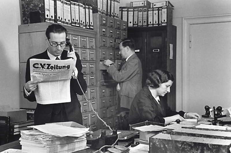 Waren Sie schon im C.V.? Nein, das meine ich nicht. Daß Sie seit Jahren Mitglied sind und immer bleiben werden, weiß ich. Ich meinte, ob Sie schon einmal in der Hauptgeschäftsstelle in Berlin waren? Wie? Nicht dazu gekommen? Das müssen wir heute, da Sie zur Hauptversammlung nach Berlin gereist sind, rasch nachholen. Wir haben uns glücklicherweise früh genug getroffen, um schon zum Dienstbeginn im Bureau sein zu können und den Tag über zu beobachten, was hier geschieht. Unser Bureau liegt in der richtigen Gegend; und die Nachbarschaft ist beinahe symbolisch für den Geist unserer Arbeit: Presseviertel, das alte Gebäude des friderizianischen Kammergerichts, die großen modernen Geschäftshäuser – so haben wir die eherne Grundlage des Rechtsgedankens und lernen am Leben um uns, ihm auf die eindringlichste Weise im Alltag Geltung zu verschaffen.“