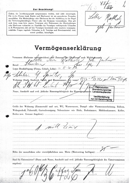 Die Vermögenserklärung von Lotte Rotholz wurde mit Kopierstift ausgefüllt; dies war häufig der Fall, wenn die „Listen“ in einer Sammelstelle und nicht am letzten Wohnort ausgefüllt wurden. Berichten zufolge durften die bedrohten Menschen in den Sammelstellen keine Füllfederhalter benutzen, weil sich Menschen damit umgebracht hatten. Auffällig bei der Akte von Lotte Rotholz ist, dass die Schrift, in der die Angaben ausgeführt worden waren, der Unterschrift im Antrag überhaupt nicht ähnelt; es scheint, als habe ein anderer – in ihrem Beisein? – die Listen ausgefüllt. Auf der letzten Seite ist die wohl letzte Unterschrift von Lotte Rotholz zu sehen in kleinen, eher unregelmäßigen Schriftzügen. Es ist anzunehmen, dass Lotte Rotholz durch ihre mehr als einjährige Haft im Zuchthaus Cottbus sehr mitgenommen war und in einem Zustand äußerster Hoffnungslosigkeit in der Sammelstelle in der Hamburger Straße ankam. Dort stieß sie auf viele Menschen, die aufgrund ihrer jüdischen Herkunft ebenfalls deportiert werden sollten. Die Deportationen hatten im Herbst 1941 begonnen, sodass im Oktober 1943 allen Betroffenen bewusst sein musste, was ihnen bevorstand.