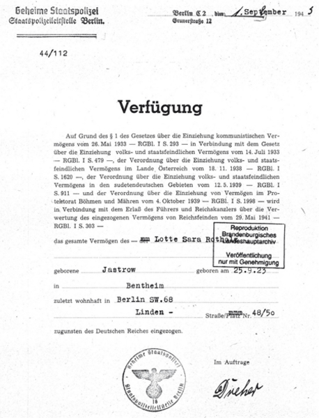 Auf Grund des §1 des Gesetzes über die Einziehung kommunistischen Vermögens vom 26. Mai 1933 RGB1. S. 293 – in Verbindung mit dem Gesetz über die Einziehung volks- und staatsfeindlichen Vermögens vom 14. Juli 1933 – RGB1. S. 479 – wird in Verbindung mit dem Erlaß des Führers und Reichskanzlers über die Verwertung des eingezogenen Vermögens von Reichsfeinden vom 29. Mai 1941 – RGB1. S. 303 – das gesamte Vermögen der Lotte Sara Rotholz, geborene Jastrow, geboren am 25.9.23 in Bentheim, zuletzt wohnhaft in Berlin SW. 68, Linden-Straße Nr. 48/50 zugunsten des Deutschen Reiches eingezogen. /