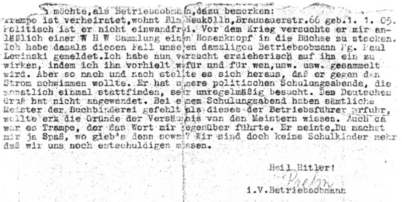 Quelle 7: Bericht des nationalsozialistischen Betriebsobmannes beim Ullstein Verlag über das Verhalten des Arbeiters Willi Trampe
