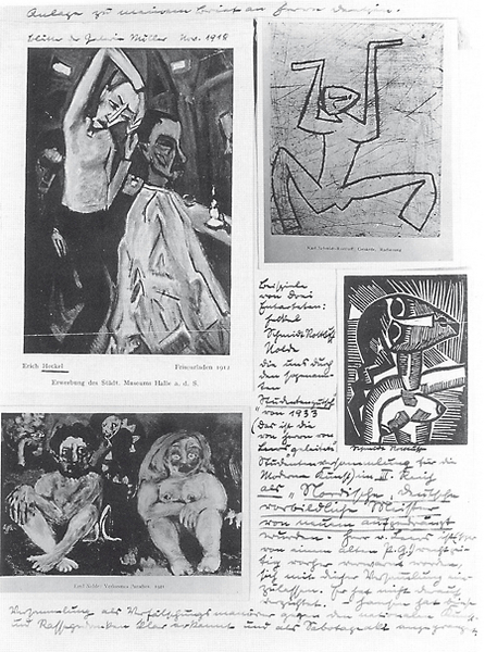 Der expressionistische Maler Emil Nolde versuchte, in mehreren Schreiben eine Abstempelung als entarteter Künstler zu verhindern. An Goebbels gerichtet bat er darum, „…die gegen mich gerichtete Diffamierung aufheben zu wollen. Ich empfinde diese als besondere Härte und auch besonders, weil ich vor Beginn der Nationalsozialistischen Bewegung als fast einzigster deutscher Künstler in offenem Kampf gegen die Überfremdung der deutschen Kunst, gegen das unsaubere Kunsthändlertum und gegen die Machenschaften der Liebermann- und Cassiererzeit* gekämpft habe, ein Kampf gegen eine große Übermacht, der mir jahrzehntelanger materieller Not und Nachteile brachte. Als der Nationalsozialismus auch gegen mich und meine Kunst die Benennung >entartet< und >dekadent< prägte, empfand ich dies sehr als Verkennung, denn es ist nicht so, meine Kunst ist deutsch, stark, herb und innig. Nach der Abtretung Nordschleswigs wäre es mir leicht gewesen ein gefeierter Künstler in aller Welt, auf Grund politischer Dinge, zu werden, wenn nicht ich meine Zugehörigkeit zum Deutschtum stets allem vorangestellt und bei jeder Gelegenheit im In- und Ausland ich kämpfend und bekennend für Partei und Staat eingetreten wäre, dabei trotz eigener Diffamierung, oder vielleicht deshalb um so mehr, von der Weltbedeutung des Nationalsozialismus zu überzeugen vermochte.“