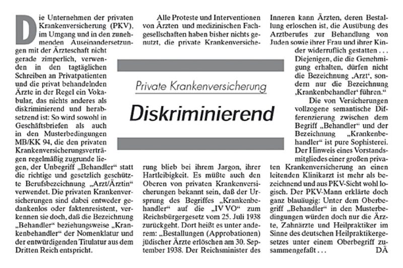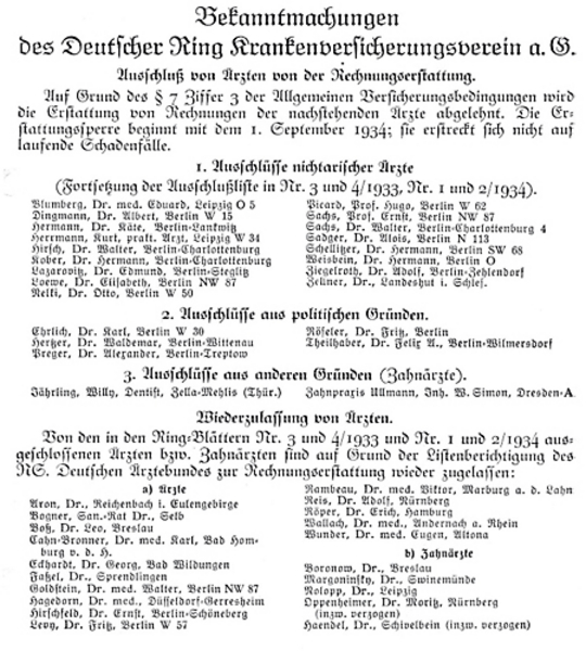 Im Mai 1933 kam der größte Zusammenschluss von PKV-Gesellschaften, der sogenannte Leipziger Verband, mit den Organisationen der Ärzteschaft, dem Hartmannbund und der Kassenärztlichen Vereinigung, überein, dass die Verbandsgesellschaften Rechnungen nichtjüdischer Patienten nicht mehr erstatten, wenn sie jüdische Ärztinnen und Ärzte in Anspruch genommen hatten. Nur noch jüdische Versicherte durften weiterhin Rechnungen jüdischer Ärztinnen und Ärzte einreichen. Rechnungen kommunistischer Ärztinnen und Ärzte sollten generell nicht mehr übernommen werden. Staatliche Stellen waren an den Verhandlungen nicht beteiligt […]