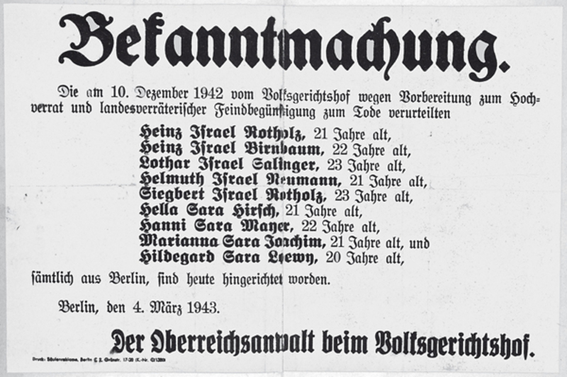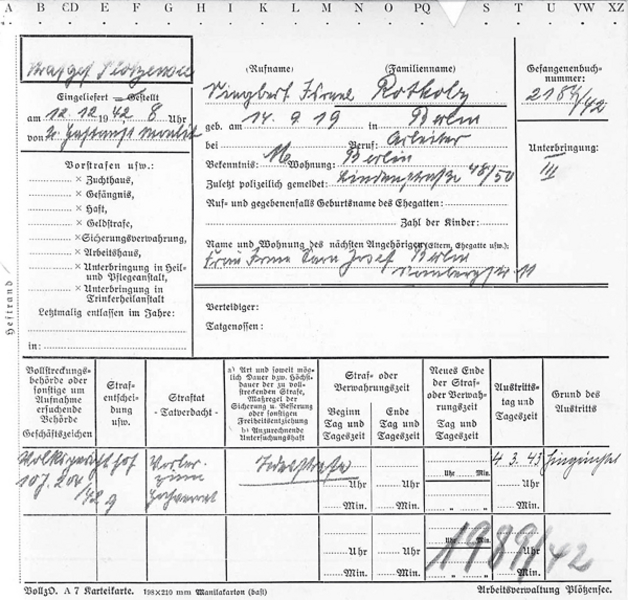 Zitiert aus: Regina Scheer: Im Schatten der Sterne. Eine jüdische Widerstandsgruppe, Berlin 2004, S. 350.; Anmerkungen: „Meine liebe Schwiegermutter“ ist Caecilie Jastrow. Caecilie Jastrow wurde am 27. Februar 1943 während der sogenannten „Fabrikaktion“* in ein Deportationssammellager gebracht und am 6. März 1943, zwei Tage nach der Hinrichtung von Siegbert Rotholz, von Berlin in das Vernichtungslager Auschwitz-Birkenau deportiert und dort ermordet. „Mein Lottchen“ ist Lotte Rotholz. Lotte Rotholz war im März 1943 im Zuchthaus Cottbus inhaftiert . Am 14. Oktober 1943 wurde sie mit dem sogenannten „44. Osttransport“ in das Vernichtungslager Auschwitz-Birkenau deportiert und dort ermordet. „Meine Schwester“ ist Irma Joseph. Irma Joseph wurde mit ihren vier Kindern am 28. Juni 1943 in das Vernichtungslager Auschwitz-Birkenau deportiert und dort ermordet.