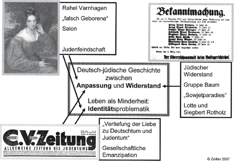 Das zielorientierte Vorgehen – typisch dafür ist die Voranstellung eines "advance organizers" als vorbereitende Lernlandkarte – beinhaltet systematische Selbstreflexionen der Lernenden und Lehrenden. Als Beispiel für einen "advance organizer" sei hier eine mögliche Variante vorgestellt, die sich auf drei typische Stationen beschränkt, die das Thema "Anpassung und Widerstand" ins Zentrum rücken.