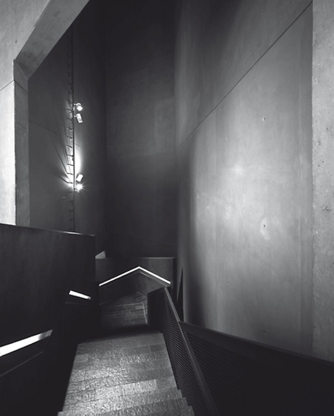„Hier ist die Treppe, die weit nach unten führt. Fast zehn Meter unter die Grundmauern des Barockgebäudes. Bis zu dieser Straße. Hier beginnen die Ausstellungsräume. Hier findet die erste Begegnung statt, im Untergrund. Dieser Teil war natürlich schwer zu bauen. Wie Sie wissen, steht Berlin ja quasi auf Wasser. Man befindet sich hier also in einer Art Boot, in einem Boot aus Beton im Untergrund.