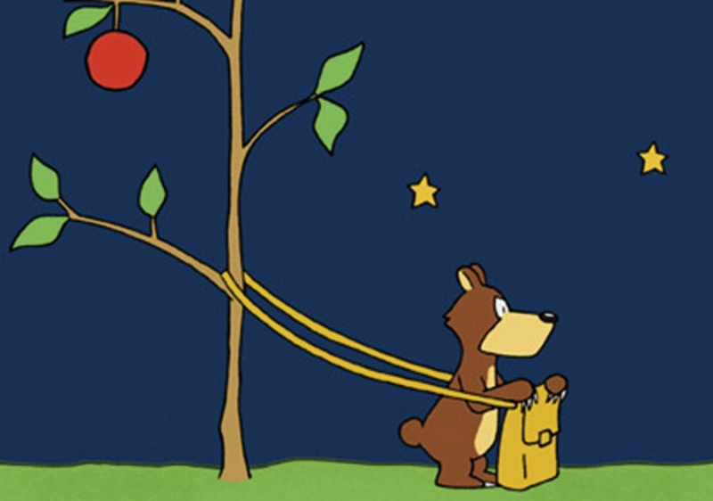 Beim Abendspaziergang der Bärenfamilie in ,SEHT MAL!‘, SAGT DER KLEINE BÄR begeistern sich die Eltern für Sonne, Wolken und den aufgehenden Mond, während ihr Spross sich damit abmüht, seine im Apfelbaum verfangene Tasche frei zu bekommen.