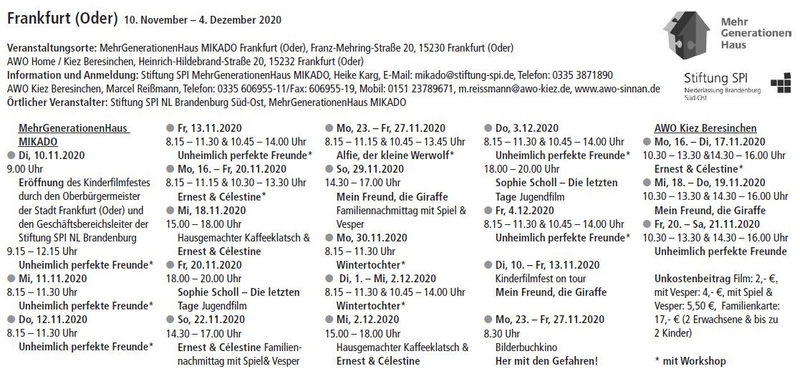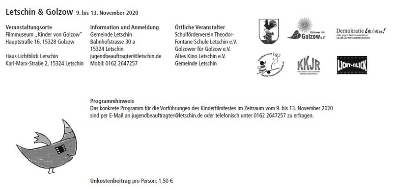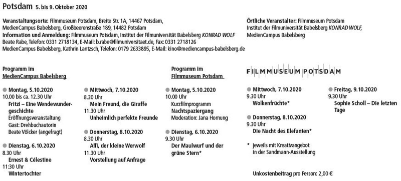 Aufgrund der aktuellen Entwicklungen bedingt durch die Corona-Pandemie muss das Kinderfilmfest in Senftenberg im November leider abgesagt werden. Wir bemühen uns, einige Veranstaltungen im Dezember nachzuholen.